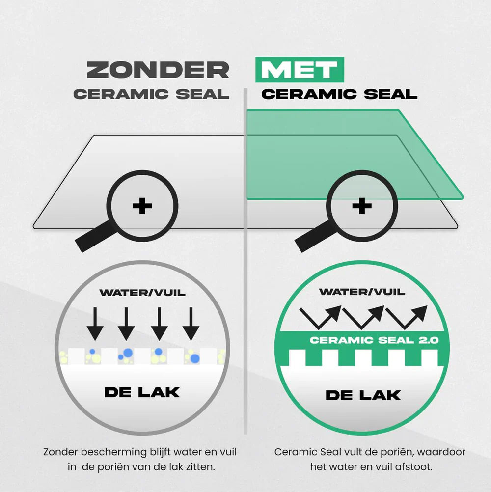 Ceramic Seal biedt een snelle en moeiteloze oplossing in vergelijking met traditionele wax. Het resultaat is een showroom glans en een waterafstotend effect dat tot 3 maanden aanhoudt.